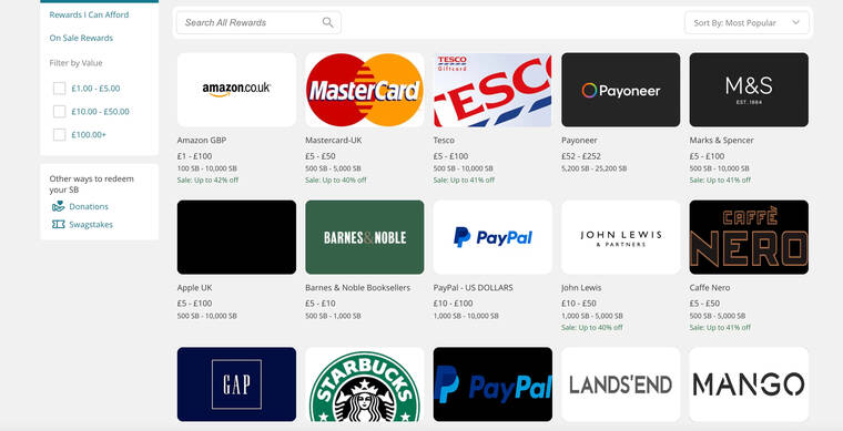 Swagbucks | 1-10%+ | 5美元 | 礼品卡、PayPal | 4.7⭐ |